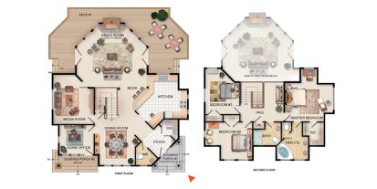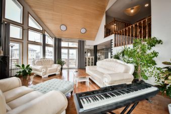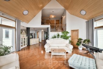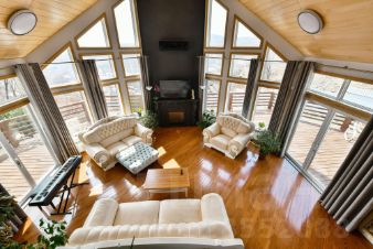 - Просторная гостиная с большими панорамными окнами и вторым светом.