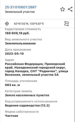 Категория земель: земли сельскохозяйственного назначения. Разрешённое использование: для ведения садоводства.