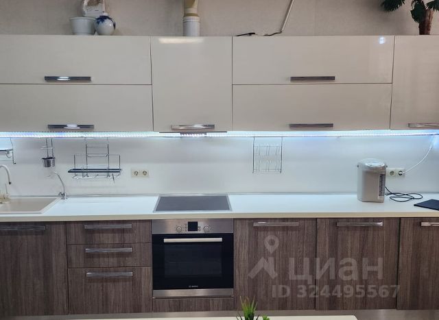 - Кухня-гостиная: кухонный гарнитур (с подсветкой всей рабочей зоны), измельчитель пищевых отходов, проточный фильтр для питьевой воды, холодильник, вытяжка, варочная панель, духовой шкаф, посудомоечная машина, чайник, светильник над обеденной зоной, телевизор 55 дюймов, шкаф со стеклянными дверками, диван;