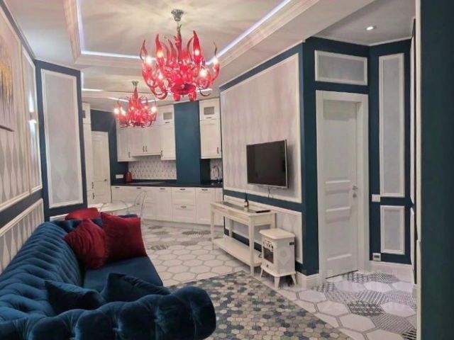 - Кухня-гостиная: кухонный гарнитур (с подсветкой всей рабочей зоны), измельчитель пищевых отходов, проточный фильтр для питьевой воды, холодильник, вытяжка, варочная панель, духовой шкаф, посудомоечная машина, чайник, светильник над обеденной зоной, телевизор 55 дюймов, шкаф со стеклянными дверками, диван;