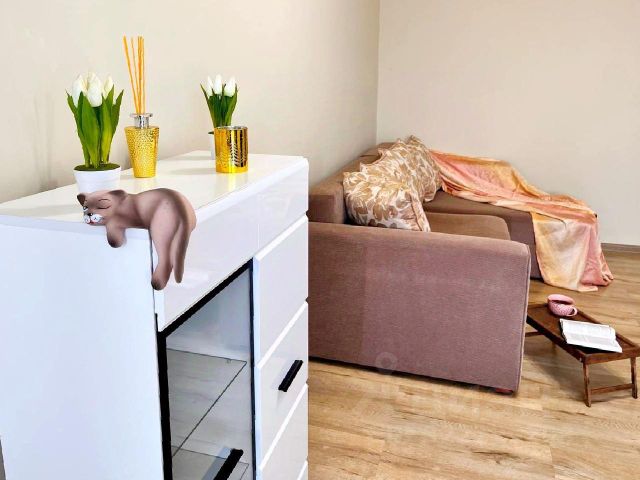 В апартаментах кухня совмещается с залом и две раздельные комнаты. Из мебели имеются: кухонный гарнитур, стол, стулья, двуспальная кровать, два раскладных дивана, шкаф, гладильная доска и сушилка для белья. Из необходимой техники: кондиционер, 2 телевизора, холодильник, стиральная машина, чайник, индукционная плита, микроволновая печь, водонагреватель, утюг. Доступны WI-FI и кабельное ТВ. В доме есть лифт, домофон. Общедоступная парковка.