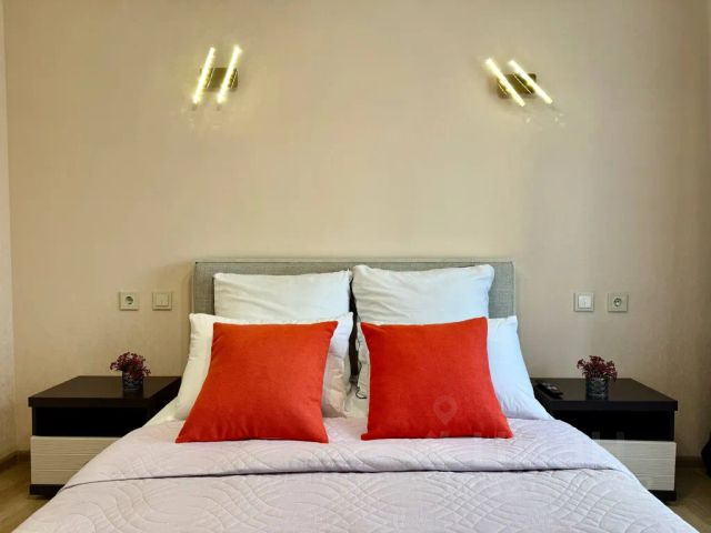 В апартаментах кухня совмещается с залом и две раздельные комнаты. Из мебели имеются: кухонный гарнитур, стол, стулья, двуспальная кровать, два раскладных дивана, шкаф, гладильная доска и сушилка для белья. Из необходимой техники: кондиционер, 2 телевизора, холодильник, стиральная машина, чайник, индукционная плита, микроволновая печь, водонагреватель, утюг. Доступны WI-FI и кабельное ТВ. В доме есть лифт, домофон. Общедоступная парковка.