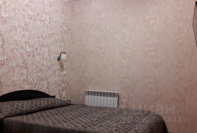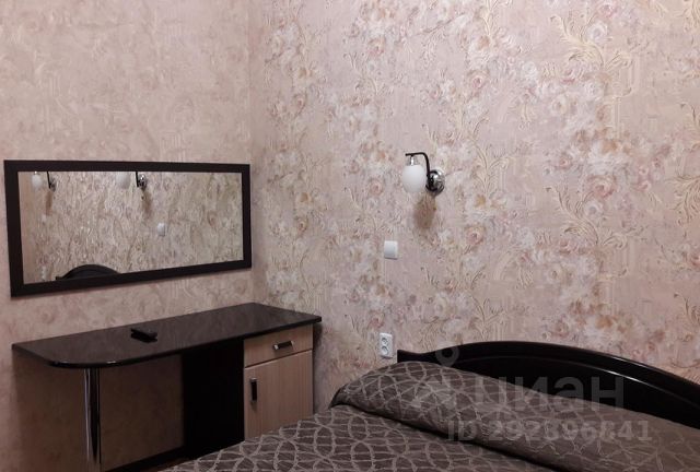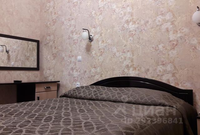 В спальне большая двуспальная кровать с прикроватной тумбочкой, туалетный столик с зеркалом и ж/к телевизор.
