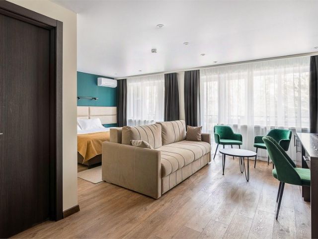 Семейный номер с видом на сопки состоит из двух комнат со смежной дверью. В одной комнате большая двуспальная кровать, а во второй две односпальные. В каждой комнате есть санузел и все необходимое для комфортного отдыха каждого гостя. Все номера в отеле для некурящих. Оснащение номера: кондиционер, электронные замки, Wi-Fi, двуспальная кровать, две односпальные кровати, стулья, вешалки, сейф, система, безопасности, ортопедический матрас, гипоаллергенное белье, зеркало, тумбы прикроватные, чайный набор, чайная станция, холодильник, телевизионная тумба, телевизор, шкаф-купе. Оснащение ванны: халаты, банные полотенца, душевая кабина, раковина, гигиенические средства, тапочки, водонагреватель, унитаз, фен. Прочее: балкон, вид на сопки, информационная карта, меню, обслуживание номеров, минеральная вода (комплимент при заселении).