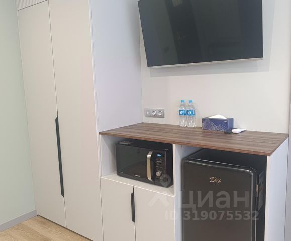 Общая гостиная комната с комфортным мягким раскладным диваном, кофейным столиком, ковролином, рабочей зоной, широкоэкранным плазменным телевизором с цифровым вещанием, вместительным шкафом, кондиционером, холодильником, индивидуальным фильтром для воды, электрическим чайником, чайными парами, набором посуды и столовыми приборами.
