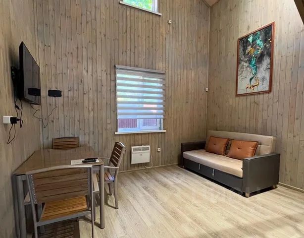 Планировка: зонированный номер, санузел (ванная), оформлен в теплых тонах, в ванной окно с видом на залив.