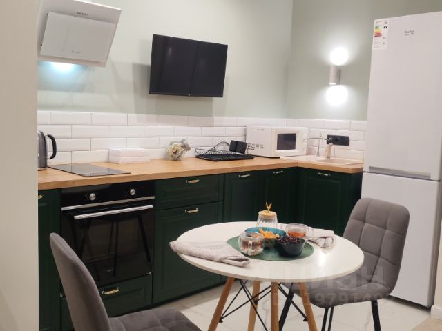Современная кухня со всеми необходимыми кухонными принадлежностями посуда, кастрюля, сковорода, ножи, и тд. ) и техникой (микроволновая печь, индукционная варочная панель, холодильник, вытяжка, электрический чайник, пароварка).