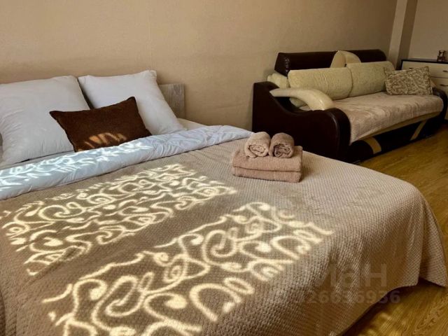 Квартира расположена на 12 этаже современного 24-этажного дома. Три лифта, в том числе грузовой. Консьерж, домофон. Студия ориентирована на запад, очень светлая и тёплая. Есть всё необходимое для комфортного проживания. Кухня: варочная панель 2конфорки, духовой шкаф, холодильник, микроволновка. Из посуды: сковорода, две кастрюли, ножи, столовые приборы, тарелки, чашки, стаканы и др. кухонные принадлежности. Двухспальный раскладной диван. Внимание! Указанная стоимость актуальна при двухместном размещении. При необходимости заселения дополнительного гостя предоставляем раскладушку (доплата 500 р/сутки) Предоставляется постельное бельё и полотенца, одноразовые зубные щётки с пастой и шампунь. Есть кондиционер, фен, гладильная доска и утюг. Подключено кабельное телевидение и Wi-Fi интернет. В санузле:душевой угол, стиральная машина-автомат, водонагреватель. Есть застеклённый балкон. Напольная сушилка для белья. Из окна открывается прекрасный вид. Маршрутка ходит почти к дому
